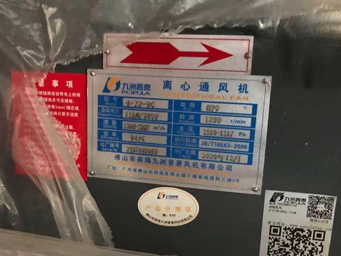 九洲4-72离心风机11KW标牌